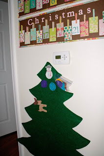 Some other holiday decorations included a felt Christmas tree I made for Evelyn, our advent calendar that I made last year, a beautiful tree wall hanging that my Grandma Fredrick made, my nativity, and my awesome stocking holder that I made! I bought some letters for the NOEL, covered them in some pretty holiday paper, attached the letters to a base that had the stocking holders. :) then I placed it on my faux mantel shelf and wa-la! I really love hour it turned out and love my stockings on it :)